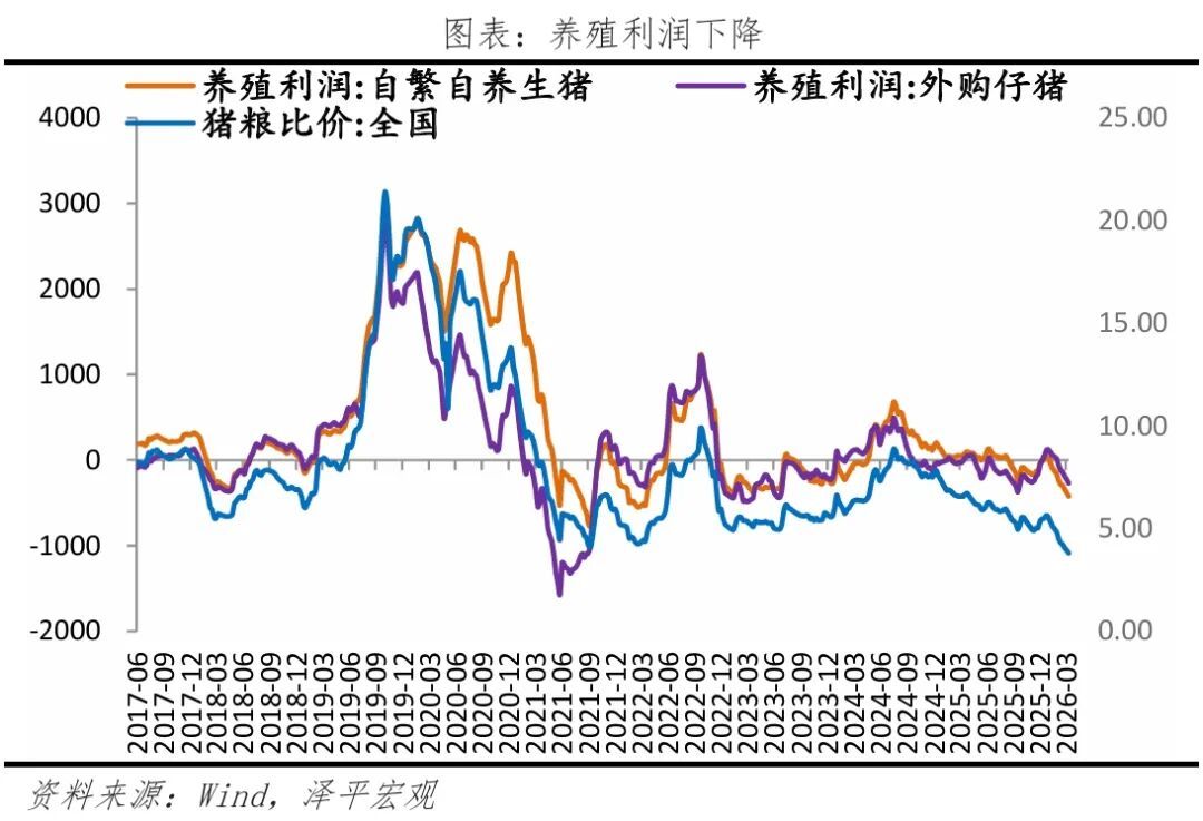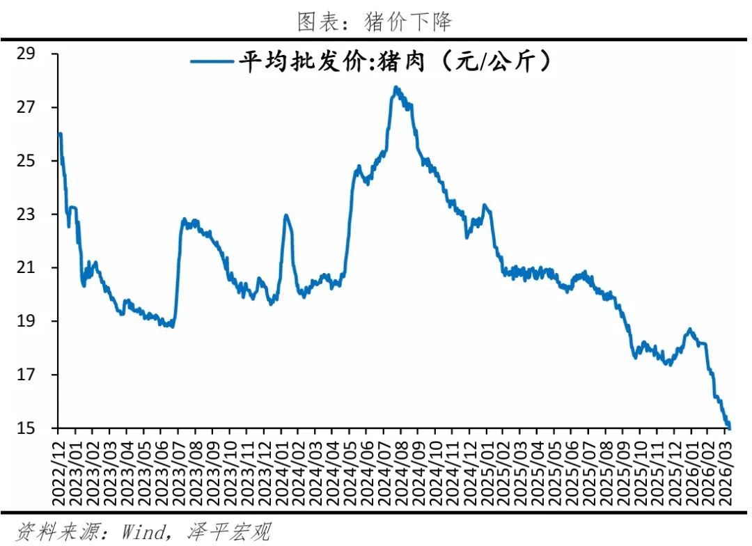 3 猪周期:下行中 3月猪价同比降幅与环比降幅均扩大。3月猪价同比-11.5%,较上月跌幅扩大2.9个百分点;环比-7.3%,较上月下滑11.3个百分点。截止2026年4月9日,平均猪肉批发价钱为14.81元/千克,较2024年8月23日的27.75元/千克已下行46.6%。