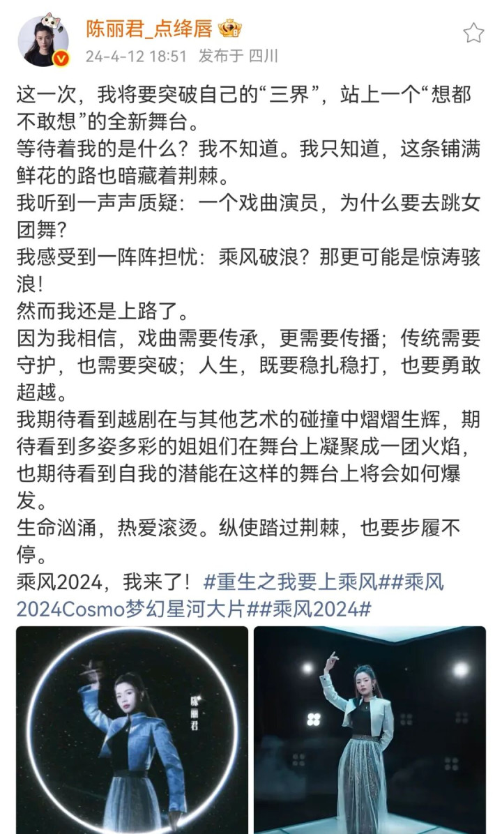 那一届浪姐,陈丽君完成了最凯旋的破圈跨界。 有东谈主质疑越剧演员去女团唱跳“不务正业”,陈丽君说:戏曲系要传承,也需要传播;传统需要防守,也需要艰涩;东谈主生既要三平二满,也要勇于艰涩。