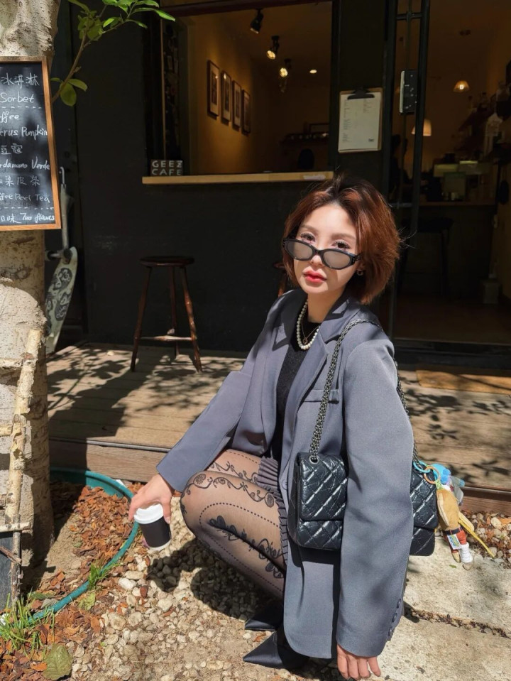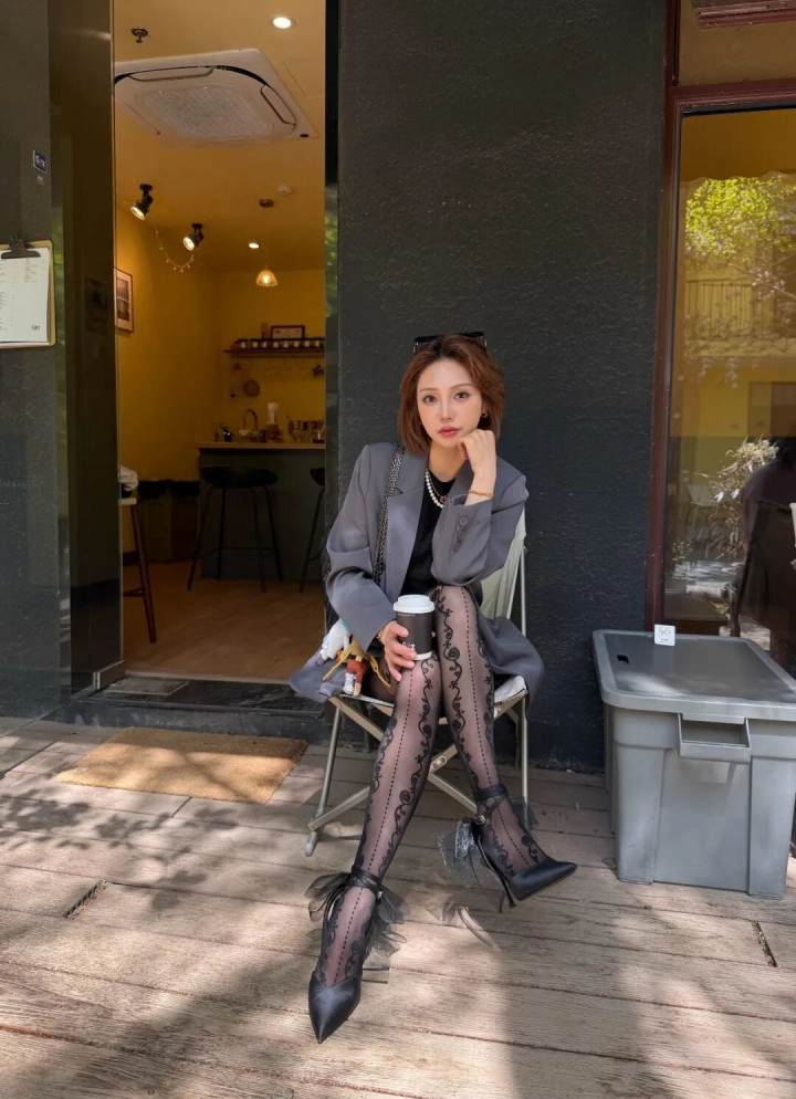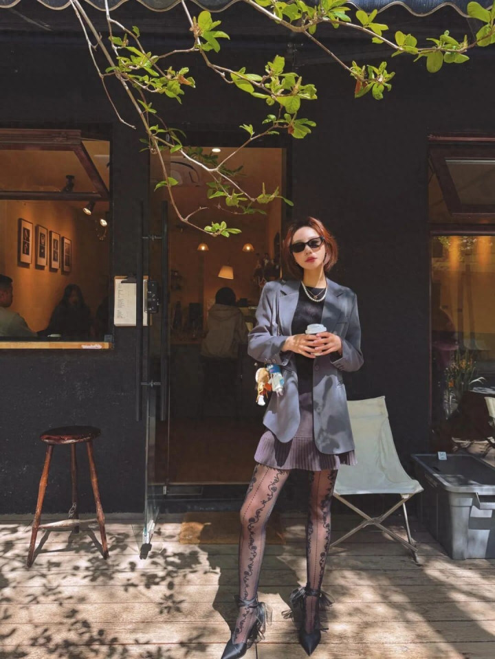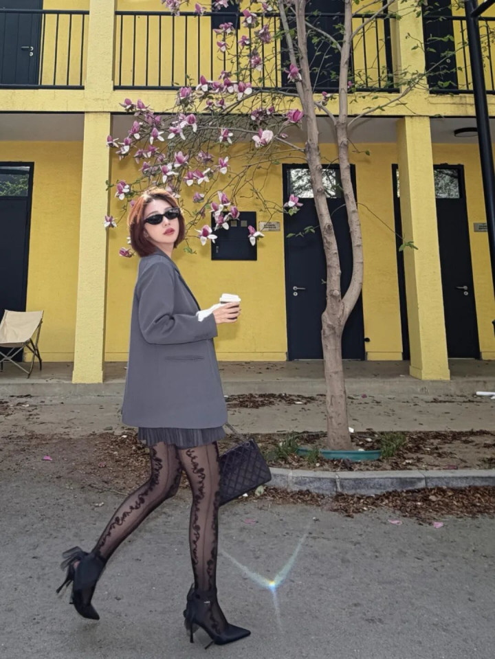 轮盘游戏app 颜值穿搭: 灰西装+百褶裙+藤蔓刺绣袜+丝带高跟