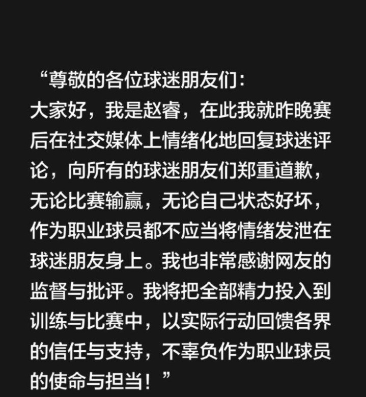 赵睿在2月2号发了道歉信,信里没提到新疆这个词,也没说明那些话到底是什么意思,配的照片不是背影就是模糊的,连脸都看不清楚,网友一看就生气,说这根本不叫道歉,像是用AI生成的模板内容,有人还翻出他以前的事,去年他冲裁判吼叫、撞人被罚下场,道歉时只说没有传递正能量,2020年直播卖月饼违规被停赛,还撞倒摄影师、穿美国队外套,每次都是删掉帖子再轻描淡写地应付过去。