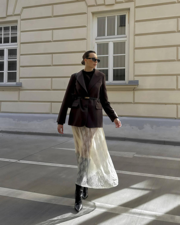 ★西装挺括有型,裙子别太软塌 大多半的西装,王人是相比挺括的版型,淌若硬挺的垫肩+厚面料西装,则不错搭配垂感强、版型利落的长裙,举例缎面、精梳棉或者Structured面料,同硬同软的穿搭,才会显得愈加高等。