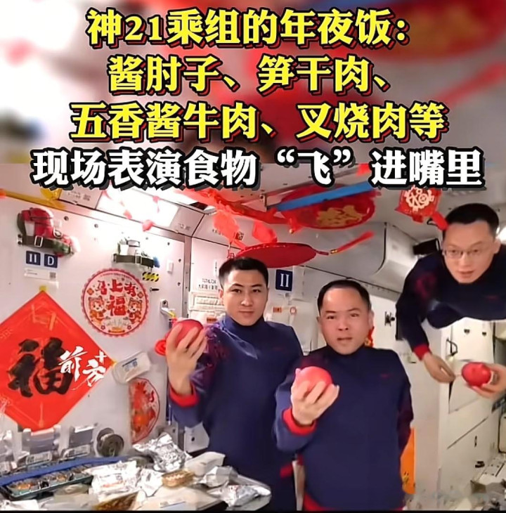 空间站中枢舱内,红彤彤的福字、喜庆的对子早已贴好,将这一方天外天下装饰得红红火火。 请示长张陆更是拿出“看家智力”,在失重环境下挥毫泼墨,写下强盛有劲的“福”字。这一刻,传统文脉与当代科技在天外中圆善归拢。 星际除夕饭,吃出“典礼感” 过年岂肯少了饺子?在天外吃除夕饭,不仅是味蕾的享受,更是时期的展示。