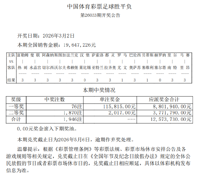 阿森纳2-1切尔西北京时间3月2日,足彩第26033期开奖成果揭晓。本期足彩头奖共开出76注,单注奖金115,815元;二等奖开出1870注2017元;任九开16,430注712元。本期足彩销量为19,647,226元,任九投注总数为18,298,052元。